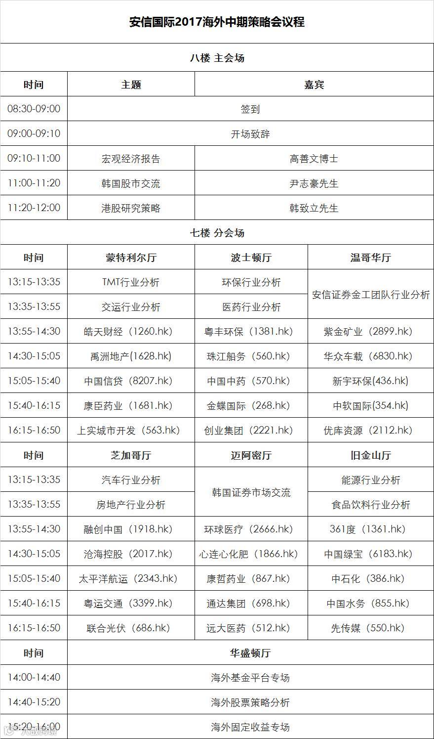 我们将竭力打造和客户深度互动的精品策略会,届时,安信证券首席经济学家高善文博士将分析中国经济的最新发展, 安信国际首席策略分析师韩致立先生将点评港股新格局的投资策略。 今次的策略会,我们特别邀请了韩国券商分析师探讨今年表现领先的韩国股市的投资机遇。下午, 各行业分析师将阐述他们具有前瞻性和影响力的观点。 我们也将请30余家极具投资价值的香港上市公司与投资者交流。策略会兹定于2017年6月20日在深圳福田马哥孛罗好日子酒店举办,借此诚邀您拨冗参加!