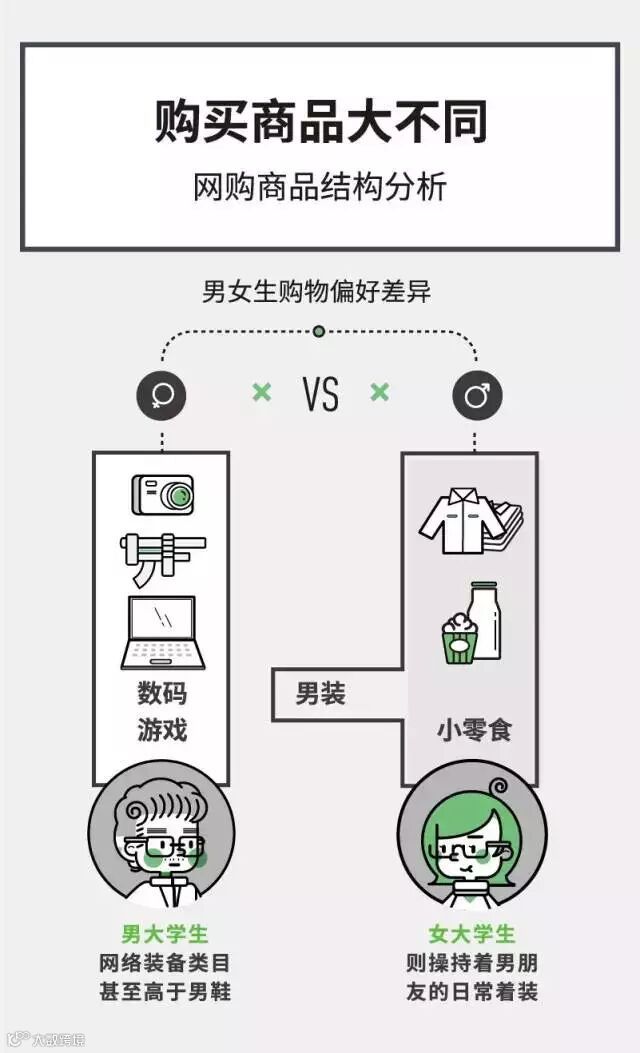 女生们购买最多的商品类型里面赫然出现了男装,大概是女生们大多操持着男朋友的衣着吧,秀得一手好恩爱: