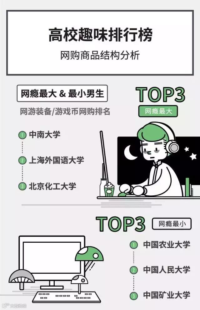 中南大学男生网瘾最大,中国农业大学男生网瘾最小;