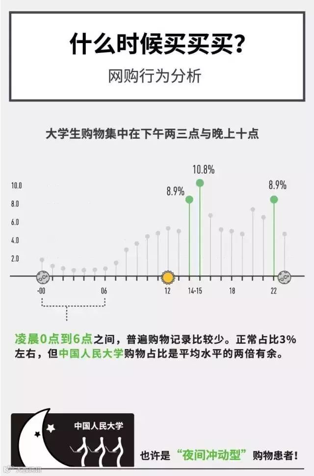 说到购物时间,大学生们大多规律生活,但是人民大学的同学们更喜欢凌晨购物,夜猫子们的凌晨购物比例比其他学校高出一倍: