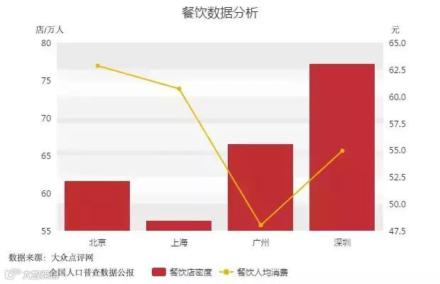 人们喜欢一座城市,总是逃离不了“美食”二字。通过每万人餐饮店数量和人均消费额来衡量4个城市的餐饮情况,可以看到,深圳居民吃饭最便捷,上海居民吃饭最不易。对比之前的服饰类消费数据,作为消费水平最低的城市,相信广州人民看到这里后幸福指数瞬间暴增。