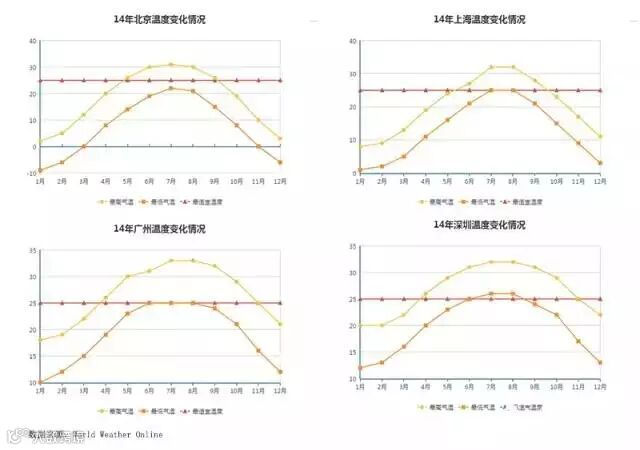 “你在北方的炕头上裹着貂,我在深圳的艳阳里露着腰”这句话成为了深圳人民调侃近段时间深圳高温天气的口头禅。上图分别表示14年北上广深最低和最高温度的分布情况,红色黄线标识为最适宜人体温度的25度。可以看到,红色横线落于最高和最低温度之间区域最多的城市是深圳和广州,而这两个城市最低气温常年均在10度以上,人们完全看不到雪花飘零,皑皑白雪的美景,对于喜欢冬天和下雪的朋友来说北京或许是最好的选择。相反,广州和深圳则是有大约6个月左右时间平均最高气温都在30度以上,桑拿天或许这又是北方城市无法体会的感觉。