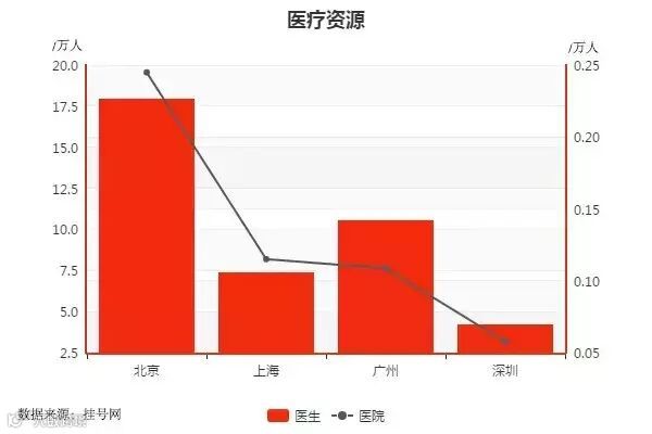 北京每万人拥有医院数量和医生数量均遥遥领先于其他三个城市,较为集中的医疗资源,被国人戏称为“全国看病中心”。而相比较其他三个城市,深圳的医疗资源则显得相形见绌,医疗资源的增长速度完全赶不上特区的发展速度。