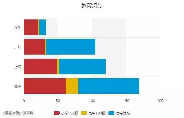 根据互联网上发布的全国小学500强,中学100强的名单以及高等院校的分布情况,统计出北上广深的教育资源分布情况。北京集中了最多的优秀教育资源,皇城根下的人们好生让人羡慕,深圳则再次垫底,傲娇的房价,薄弱的民生基础建设,真是令无数深圳人欲哭无泪!