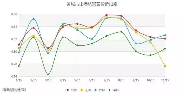 从15年以来北上广深机票折扣率分布可以看出,各地机票价格变化趋势基本一致,3月份无疑是最划算出行的时间。深圳的机票折扣率远低于其他三个城市,从这点看来,深圳人民无疑是幸福的。