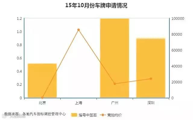 除了公共交通,私家车对于在城市里生活的人们来说无疑也是衡量幸福感的重要指标之一。目前北上广深均采取了限牌的策略,而想要获取车牌,目前只有摇号和竞价2种方式。针对15年10月份四个城市2种方式的车牌申请情况进行统计(0表示该城市没有此种申请方式),广州无论从中签率还是竞拍均价上再次展现出了满满的幸福感。上海近乎8万的竞拍价格令所有国人唏嘘不已,或许这就是国际大都市该有的气质吧。