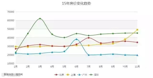 一谈到房子,作为在一线城市打拼的人来说满满都是泪。上图表示15年以来北上广深二手房的房价变化趋势(新房对我们而言纯粹是奢望,此处不予讨论)。可以看到,深圳房价从今年3月份开始,以火箭般的速度异军突起,接连超越北京和上海。北京和广州受到深圳房价的影响,在之后的二三个月内房价也相继上涨,随后又回落,上海的房价则是在10月份开始上涨。广州的房价和他的“衣食”指标相吻合,位列四个城市最低水平,看来最幸福一线城市桂冠属于广州人民啦!