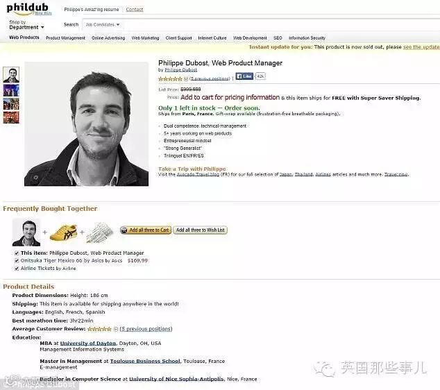 有个想找电子产品相关工作的哥们,把自己的简历做成了亚马逊页面。