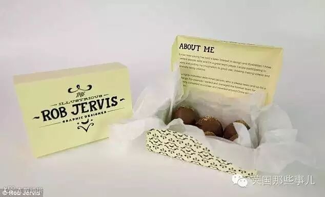 盒子上写有自己的大名,里面装着巧克力,盒子内侧印有一个About Me的版块,那里是他的自我介绍,本来就是做创意的人... 靠着这个创意。。哥们最后拿到了这个工作。