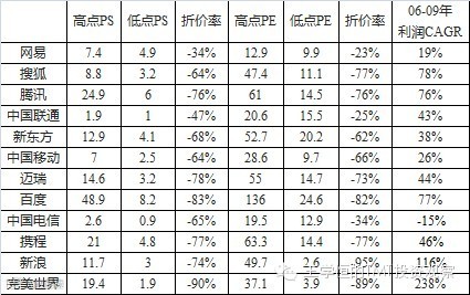 这里用P/S,P/E来看看高低点的估值摆动。2007年10月10日与2009年3月9日,几个龙头公司的PS分别为网易7.4/4.9,搜狐8.8/3.2,腾讯24.9/6.0,中国联通1.9/1.0,新东方12.9/4.1,中国移动7.0/2.5,迈瑞14.6/3.2,百度48.9/8.2,中国电信2.6/0.9,携程21/4.8,新浪11.7/3.0,完美世界19.4/1.9。再看看PE,网易12.9/9.9,搜狐47.4/11.1,腾讯61/14.5,中国联通20.6/15.5,新东方52.7/20.2,中国移动28.6/9.7,迈瑞55/14.7,百度136/24.6,中国电信19.5/12.9,携程63.3/14.4,新浪49.7/2.6,完美世界37.1/3.9。