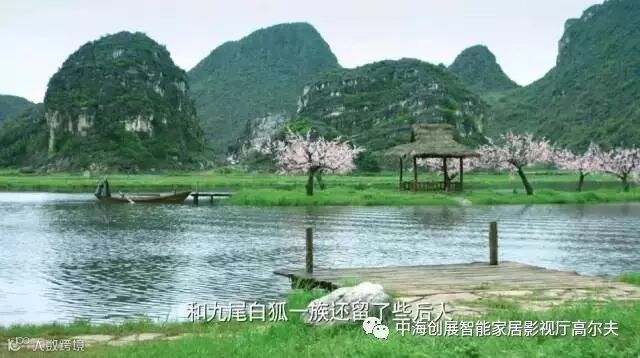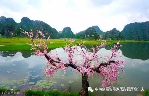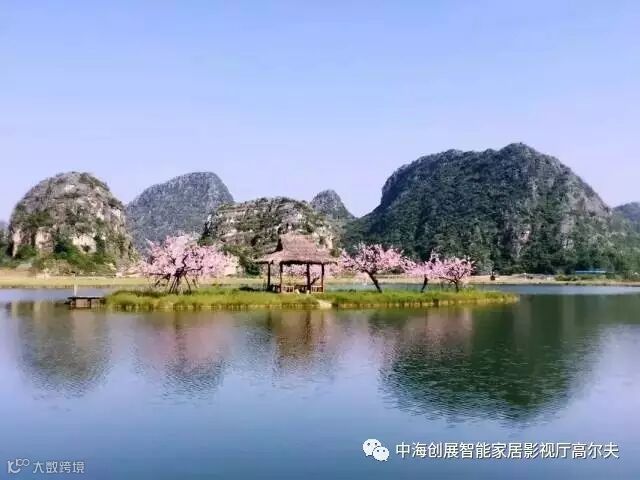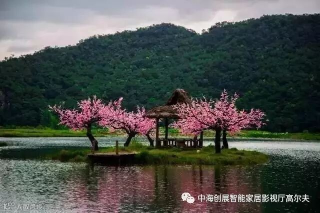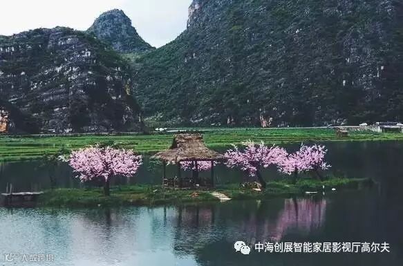 一望无际的桃园、星罗棋布的孤峰、清澈透明的水面一起组成了独一无二的喀斯特山水田园风光。