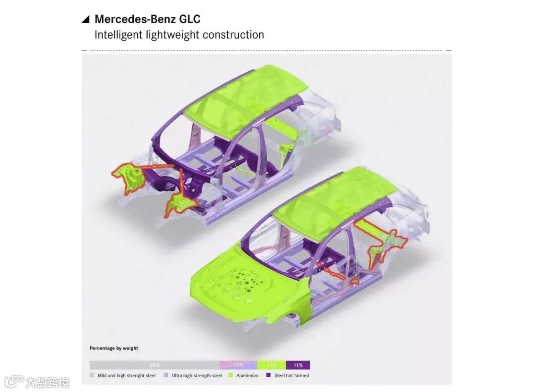 在GLC海外版的官方示意图上,车身覆盖件,一共有三处采用了铝合金,分别是引擎盖、翼子板,以及车顶(无天窗版)。在售进口奔驰GLC300这三处都是铝合金的,欢迎小伙伴前来验证。