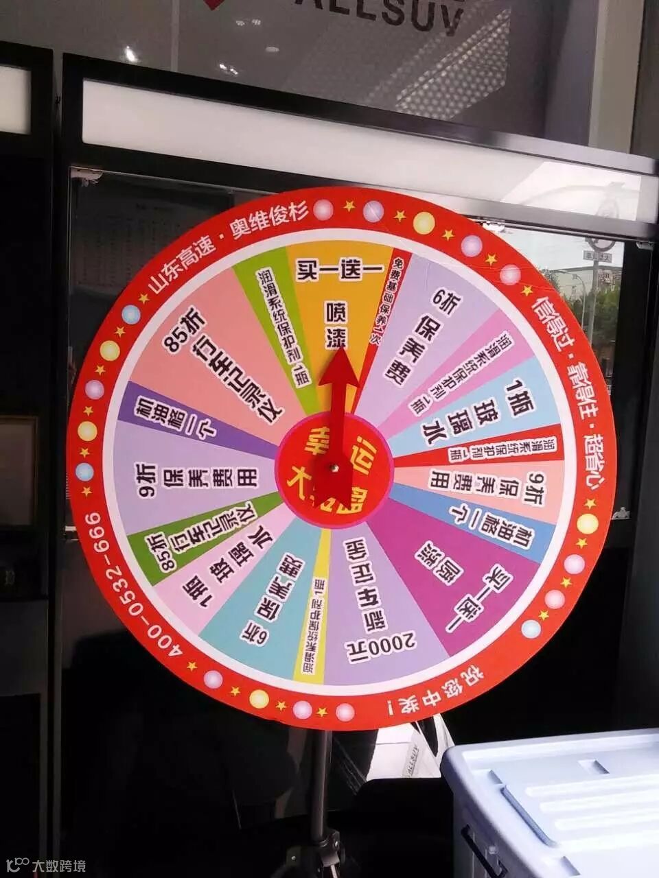 到店大转盘奖品包括:免费基础保养1次、润滑系统保护剂1瓶、机油格1个、保养费用9折、保养费用6折、行车记录仪8.5折、油漆喷一赠一、玻璃水1瓶、新车购车金2000元(亲朋好友可用)。
