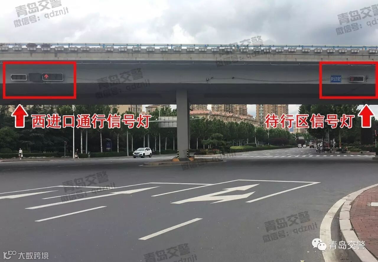 请注意区分西进口和待行区信号灯