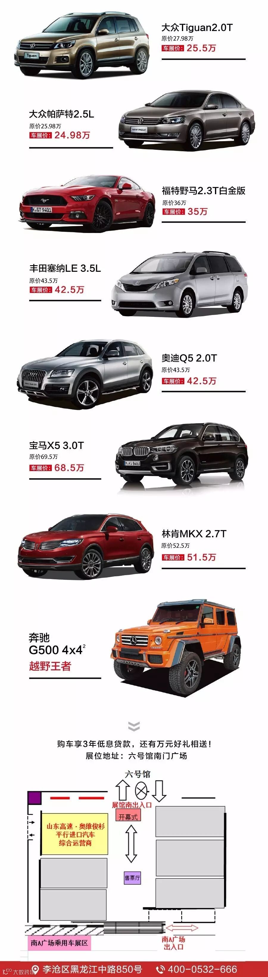 本次春季车展,山东高速·奥维俊杉带来了优质的车型,实惠的价格:大众Tiguan、大众帕萨特、奥迪Q5、林肯MKX、福特野马、丰田塞纳、宝马X5、宝马X6、奔驰G500 4x42,更多车型请至青岛旗舰店。