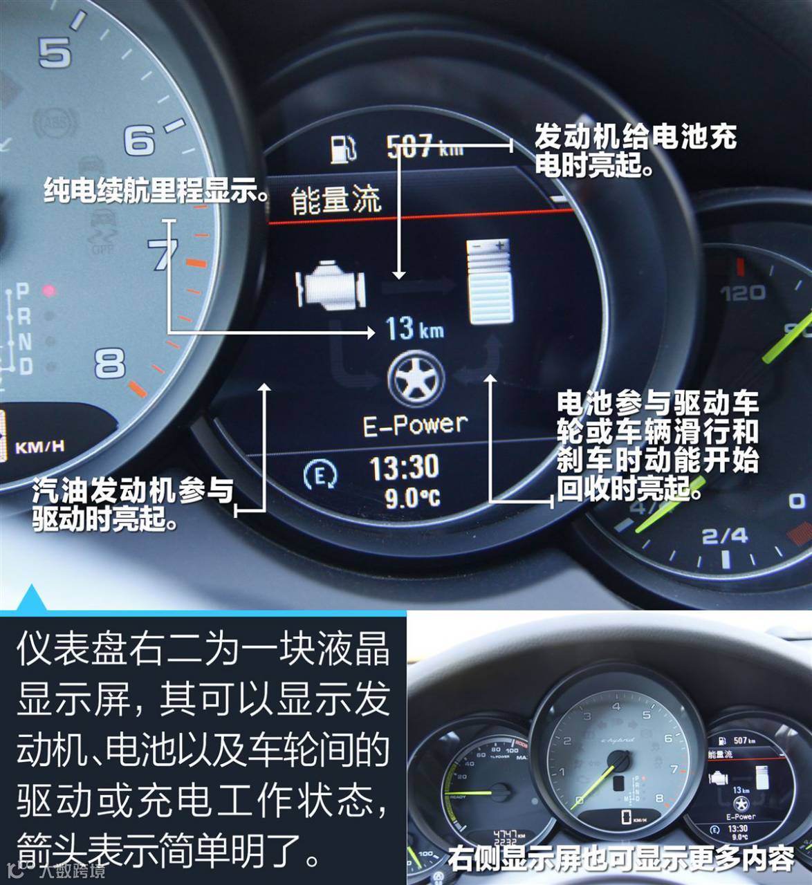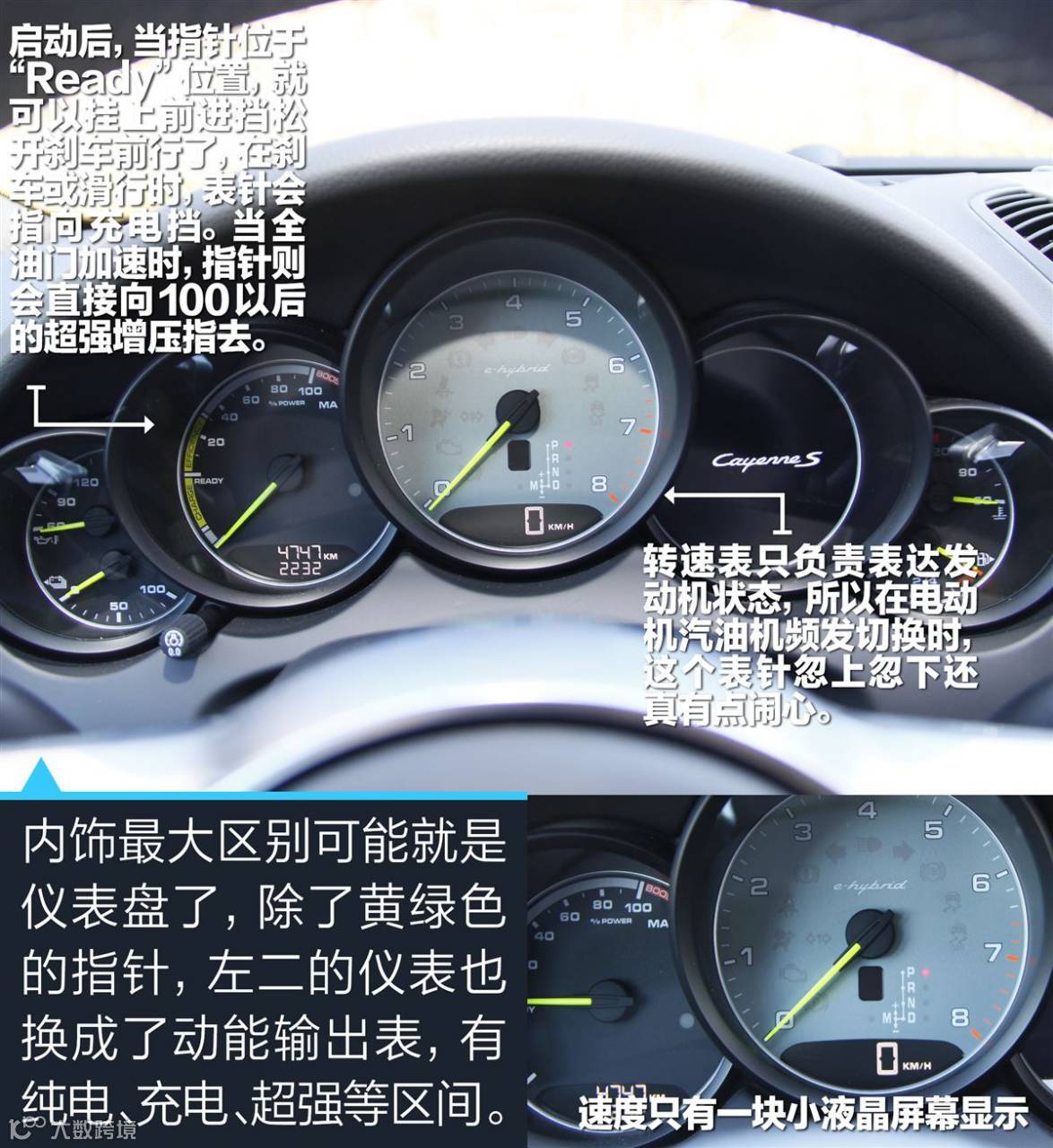 外观上很有趣的一点就是这货有两个加油口,其实其中一个是插电口。很多人问小胖哥如果没电了怎么办?小胖哥是这么回答的,凉拌。没电了就当成个普通的汽油车开就行了,就这么简单。油混卡宴充电有两种方式,第一,用充电口,普通的220V就行,随车附带充电线。第二,行驶中充电。当你刹车或者滑行的时候,大电池就会回收动能。纯电动行驶大约36公里,足够用了。这不是一款纯电动车,再说一次。文章后面会给大家说基本的工作原理的。