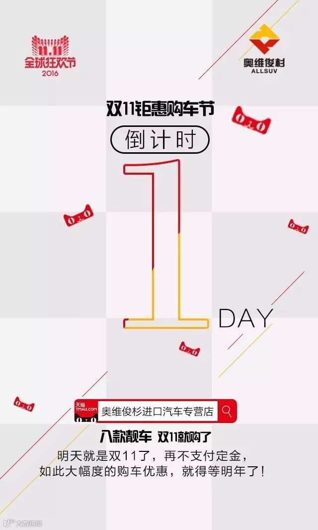明天就是双11,你准备好了吗?奥维俊杉天猫双11预售已经接近尾声,现在是最后的抄底价购买爱车的机会,赶快登陆天猫“奥维俊杉进口汽车专营店”订购爱车吧。