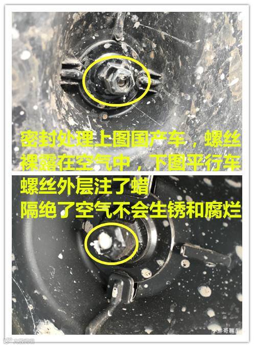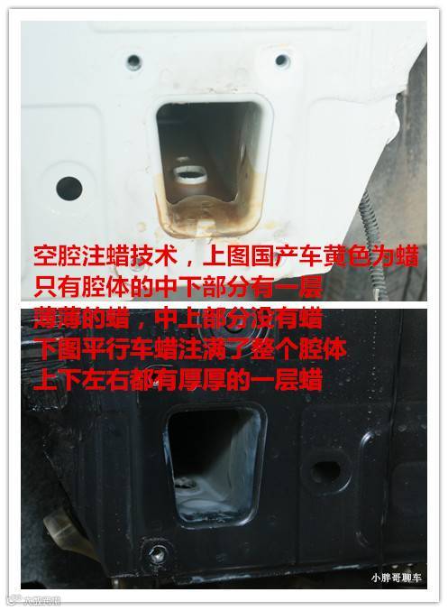 一台车的使用年限大概是12-15年,平行进口车的蜡充满了整个的腔体,隔绝了空气也就不会发生腐烂和生锈,小胖哥认为在它的使用年限里在这个位置上是不会出现任何腐蚀的。而国产的,只有一部分腔体有蜡的保护,使用的年限就不得而知了。