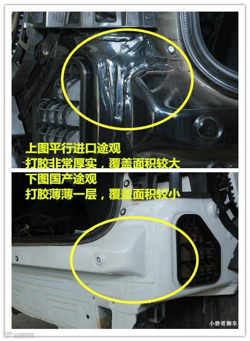 再看看车尾部打胶的情况。平行进口的很明显胶打的厚实,面积也大,发生碰撞的时候强度相对来说更好。就像我们自己家里装修,无论什么位置打胶,都要尽量做到够厚实覆盖面更大,这样才能稳固可靠安全性才更好。