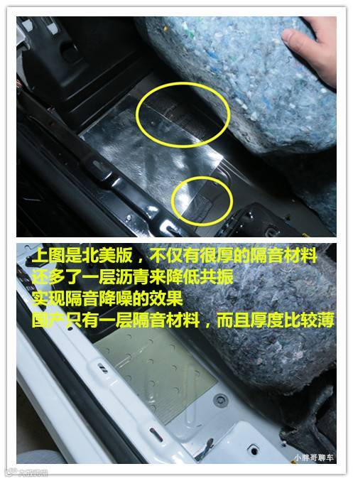 再看看小胖哥非常重视的一点,隔音降噪上的差异。上图北美版不仅有隔音材料,还有一层沥青,这种工业沥青的作用是减少共振,降低声噪。降噪水平高,车行驶起来就会更加安静,相对来说驾驶的感受也就越好。