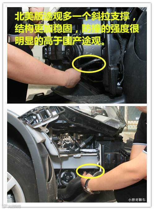平行进口的途观在这方面做的确实没的说,非常靠谱,无论是钢板厚度,框架结构确实是更胜一筹的。下面看图说话。首先是两辆车在前杠的外面都有保护的发泡材料,它主要的作用是抵抗轻微的碰撞,给前保险杠一个缓冲,很多车根本就没有这一层材料,这一点两辆车都不错。