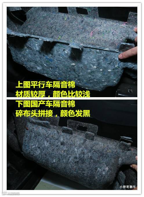 说到了隔音棉,国产途观的隔音棉简直是小作坊里出来的,不仅颜色黑乎乎的,几乎全是碎布头拼起来的,你要说这东西能达标,我真就不信了。图片上可能因为拍照的光线问题没那么明显,但真见到实物,就知道差异了。