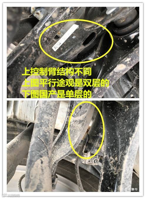 上控制臂的结构的差异,一个是两层的,一个是一层的,哪个更结实,一目了然。