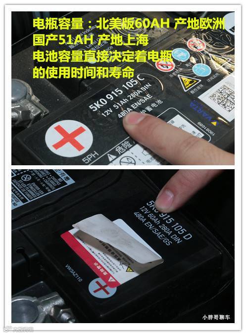 电瓶容量的不同,产地不同。两个电瓶的大小目测就完全不一样。国产51AH,进口60AH。电瓶容量越大,使用寿命越长,也越可靠。电瓶这事真的可大可小,当你电瓶没电了,大冬天的早晨拉不起车,那个滋味只有经历过的才明白。那种心情用呵呵都是无法形容的。