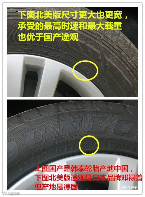 再来看看轮胎尺寸和规格。平行进口的是邓禄普235 55R17 99V,产地是德国。国产是韩国品牌韩泰215 65R16 98H,产地是中国。无论是尺寸还是抗压指数最大承受速度都高于国产轮胎。98代表着最大载重750公斤,H代表着最高时速是210公里。99V分别是775公斤和240公里。