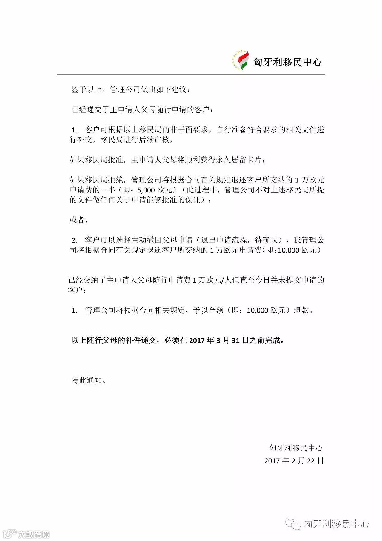 客户要求进行补交,移民局进行后续审核,如果移民局批准,主申请人父母将顺利获得永久居留卡片;如果拒绝,管理公司将退还客户所交纳的1 万欧元申请费的一半(即:5,000 欧元)(此过程中,管理公司不对上述移民局所提的文件做任何关于申请能够批准的保证);或者客户可以选择主动撤回父母申请管理公司退还客户所交纳的1 万欧元申请费。