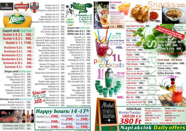 按照匈牙利人下馆子的习惯,首先要喝的,先喝起来,然后再点吃的。所以服务员至少要跑两次下单。菜单分好几种: