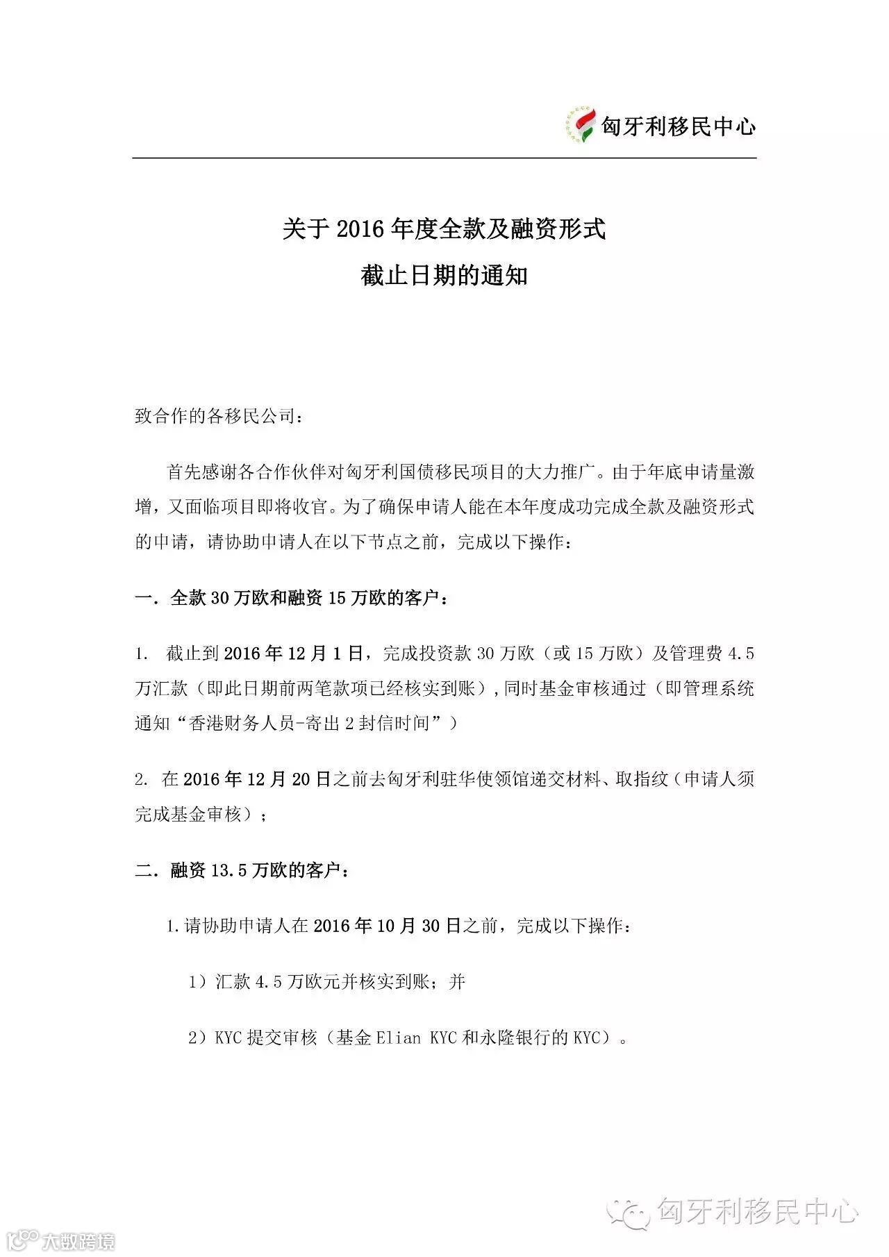首先感谢各合作伙伴对匈牙利国债移民项目的大力推广。由于年底申请量激增,又面临项目即将收官。为了确保申请人能在本年度成功完成全款及融资形式的申请,请协助申请人在以下节点之前,完成以下操作: