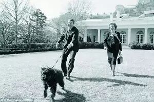 罗纳德·里根在白宫草坪上遛狗时,玛格丽特·撒切尔也加入进来