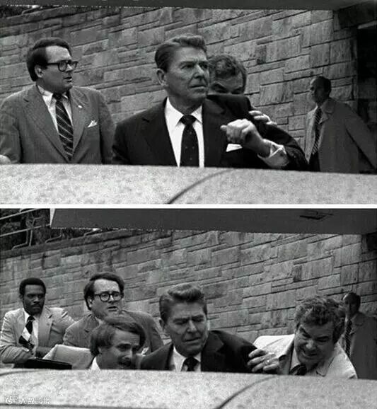 1981年3月30日,里根演讲完毕走出希尔顿饭店。刺杀就在这个时候开始了。正当里根接受媒体采访时,枪声响起。特工麦卡锡扑向凶手,用自己的身体挡住里根,从而使最后几枪都打偏了。子弹偏离后,打在防弹车上,反弹进里根胸部,击断肋骨后钻进离心脏仅3厘米的地方。里根受伤但无生命危险。杰瑞·帕尔一把抱住里根,与其一起躲进了总统轿车。图为事发瞬间,图右为特工杰瑞·帕尔