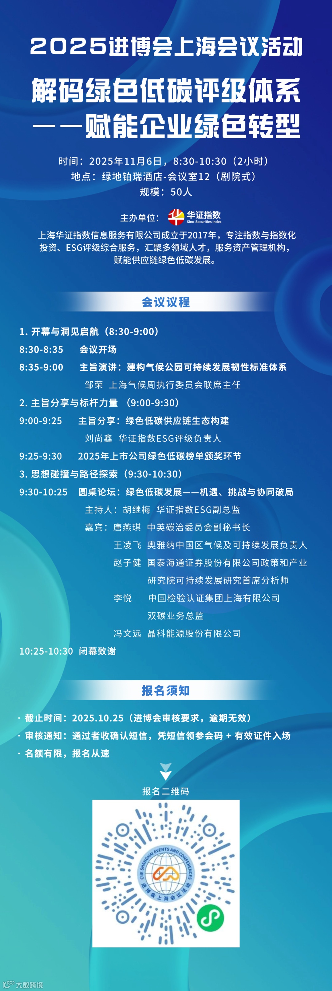作为进博会重要组成,2025“进博会上海会议活动”(11月6日-9日)以“破局共生,韧性增长”为主题,打造全球开放合作生态。上海华证指数信息服务有限公司将主办专题边会,聚焦企业绿色低碳转型,支持企业可持续发展。