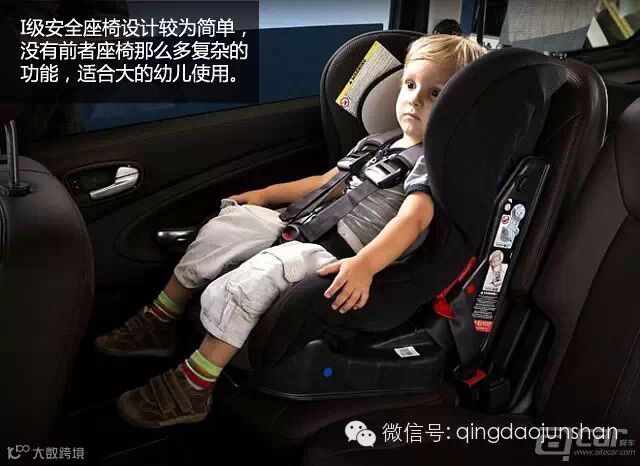 I 级安全座椅设计较为简单,没有前者座椅那么多复杂的功能,适合年龄稍大的幼儿使用。而且本身配备高度可调供孩子使用的安全带,以适应孩子不断增长的身高。这种座椅一般靠两或三个连接点,即 ISO FIX 或 LATCH 接口与汽车座椅相连接。当然,只依靠座椅上的安全带同样可以固定。