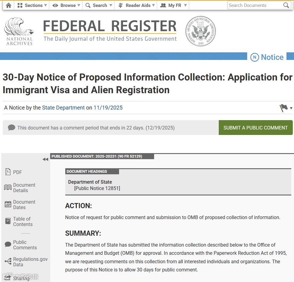 美国国务院近日向管理与预算办公室(OMB)提交了 新版 DS-260 表格 的修订方案。相关内容已于 2025 年 11 月 19 日正式发布在 Federal Register(联邦公报),并进入 30 天公众意见征集期。