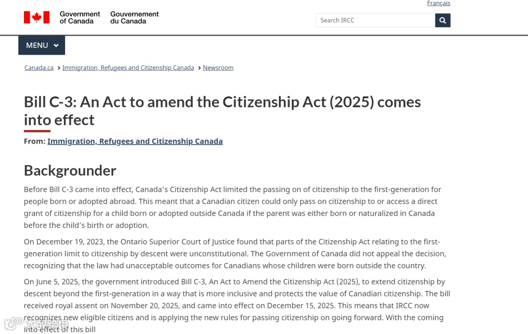 当地时间 2025 年 12 月 15 日,加拿大《公民法修正案》(Bill C-3)正式生效。这项酝酿近两年的法案,被普遍视为加拿大公民制度数十年来最重要的一次调整之一。