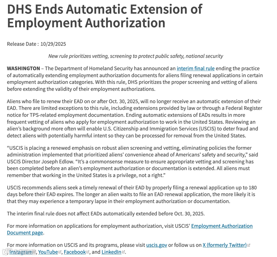一项影响在美外籍劳工与移民家庭的重要政策正式落地。美国国土安全部(DHS)宣布,自2025年10月30日起,EAD工卡(I-765)“自动延期”机制将被彻底取消。这意味着,过去那段允许续签申请人“无缝过渡”的540天宽限期将成为历史。从此,工卡到期即失效,除非新卡获批,否则申请人必须停止工作。