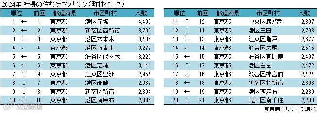 调查结果显示,东京的港区赤坂、西新宿和六本木仍然是社长最集中的街区。