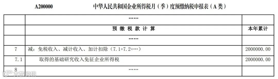 预缴申报时,在《中华人民共和国企业所得税月(季)度预缴纳税申报表(A类)》(A200000)第7行“减:免税收入、减计收入、加计扣除”下的明细行次填报相关免税收入情况。手工申报的,在明细行次填写“取得的基础研究收入免征企业所得税”事项名称及优惠金额。通过电子税务局申报的,可直接在下拉菜单中选择相应的优惠事项名称,并填报优惠金额。相关优惠事项名称和优惠金额填报要求可参见国家税务总局网站发布的《企业所得税申报事项目录》。