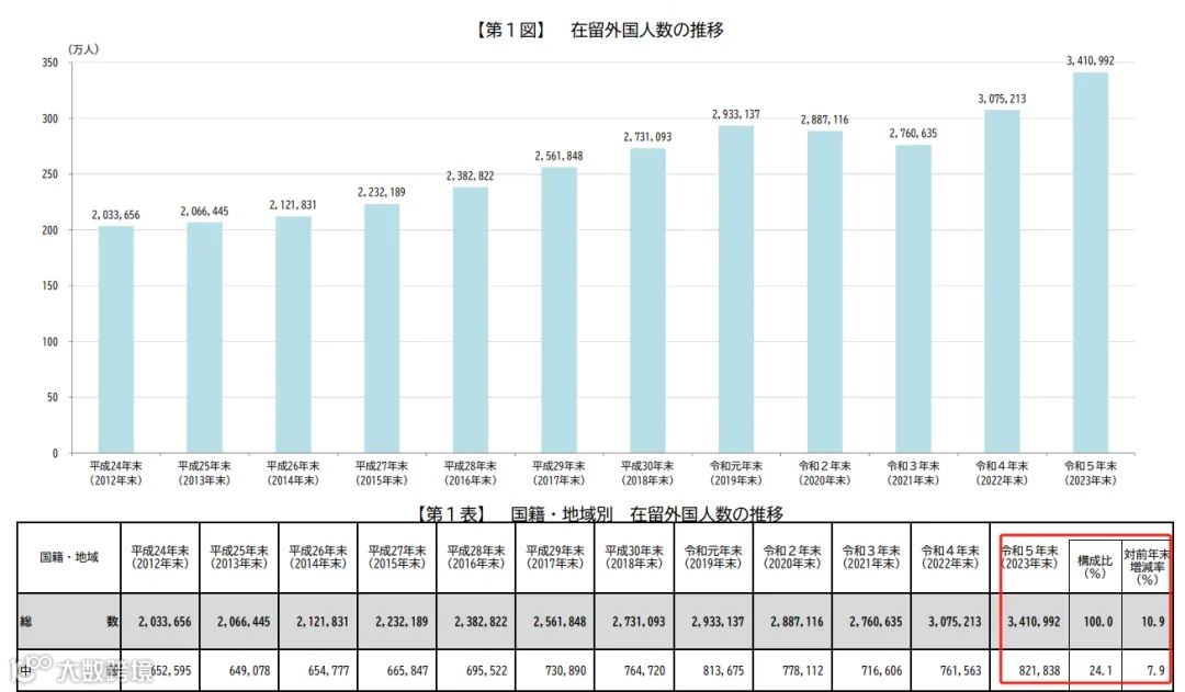 根据日本出入国在留管理厅最新公布数据:截至2023年12月底,中长期生活在日本的外国人数量,达到创纪录的341万992人,同比激增10.9%;