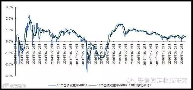 钱荒之后,以10年国债收益率减R007计算的期限利差基本上可以分为三个阶段: