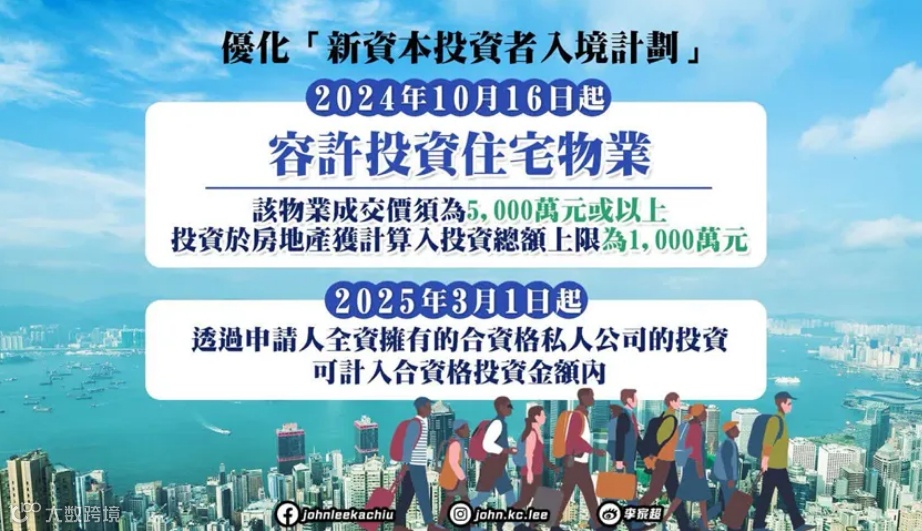 今年最新发布的《2024施政报告》再次优化新投资移民计划,2024年10月16日起,容许投资住宅物业,该物业成交价须为5,000万港元或以上,投资于房地产获计算入投资总额上限为1,000万港元。