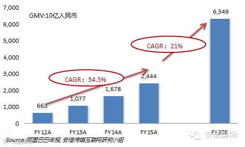 二、电商行业增速首次低于30%,公司市场份额出现一定下滑,跨境电商成为新增亮点。本季度阿里巴巴GMV增速在15个季度中首次低于25%;其中天猫GMV为RMB4,010亿,+36.8% YoY, +45.8% QoQ占总体GMV比重为41.6%,天猫的增速也从过去50%以下开始下滑。本季度以天猫国际为代表的跨境电商业务成为新的增长点,交易额同比增长179%,有超过200个国际品牌在天猫平台开设了旗舰店。根据15年年报中提到的2020年1万亿美元的GMV目标,未来5年复合增长率将为21%,规模基数下低于30%的GMV增长将成为新常态。
