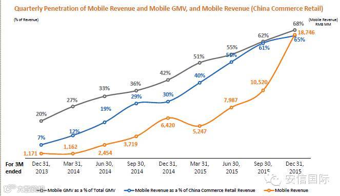 移动端MAU: 为3.93亿,+48.3% YoY, +13.6% QoQ,占该季度活跃买家96.6%,占中国移动互联网6.2亿用户(2016年1月)63.4%。