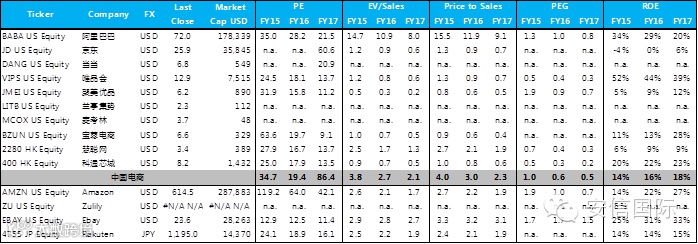 图3: 中国互联网电商类上市公司与海外可比同比估值对比表