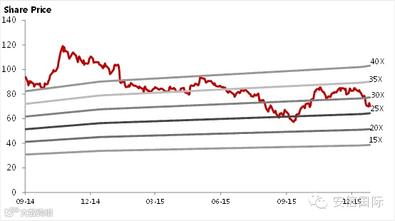 公司移动端货币率的持续改善和提高(移动端货币化率达到2.88%),阿里云的高速增长(RMB8.19亿, +126.2% YoY,近15个季度增速仅次于上季度)、钉钉首次公布100万企业用户、天猫国际GMV同比增长179%以及物流基础设施进一步巩固是本季度的亮点;但行业增速的下滑以及公司份额的下降使得公司面临一定压力,公司当前股价对应FY16E/FY17E的P/E分别为28.2x和21.5x,位于24x-60x之间的估值下限,可关注。