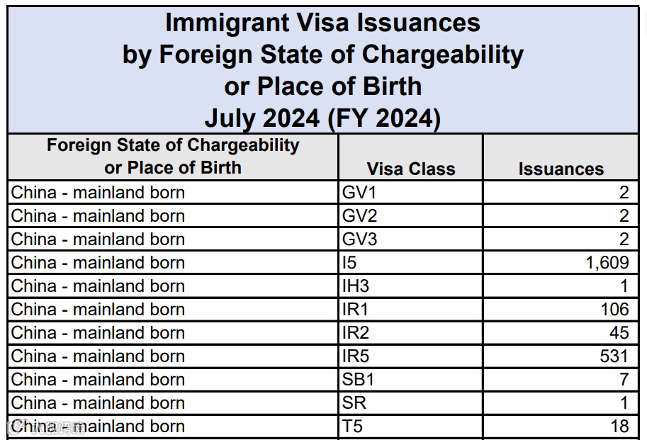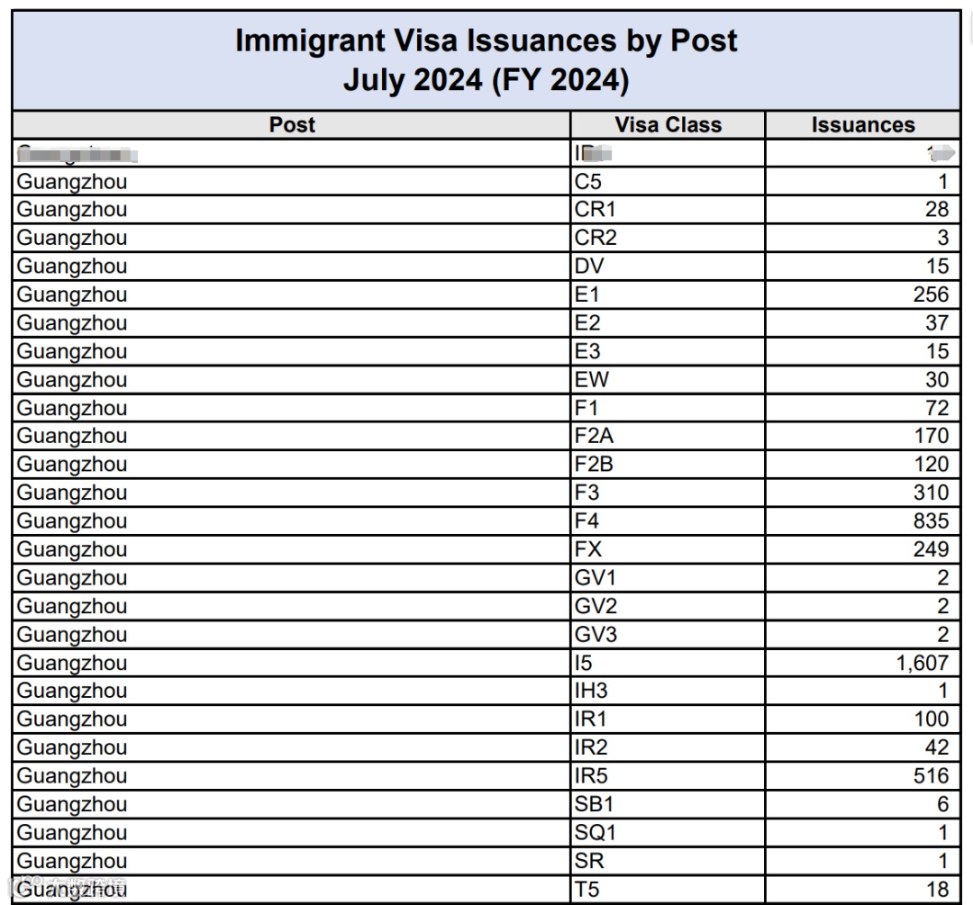 近期美国国务院发布了2024年7月份移民签证发放的统计数据。统计有两份表格,一份是按照申请人出生国别发放的签证数量统计,另一份是按照各地使领馆发放的签证数量统计。
