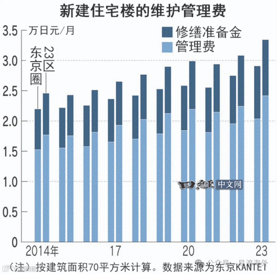 日本不动产调查公司东京KANTEI的数据显示,2023年东京圈的新建住宅楼管理费为每户(建筑面积70平方米)每月20358日元(约合人民币916.2元),同比上涨4.1%。这是自2014年开始调查以来首次超过2万日元。加上修缮准备金,全年达到约35万日元(约合人民币1万5751元),东京都23区超过40万日元(约合人民币1万8001元)。